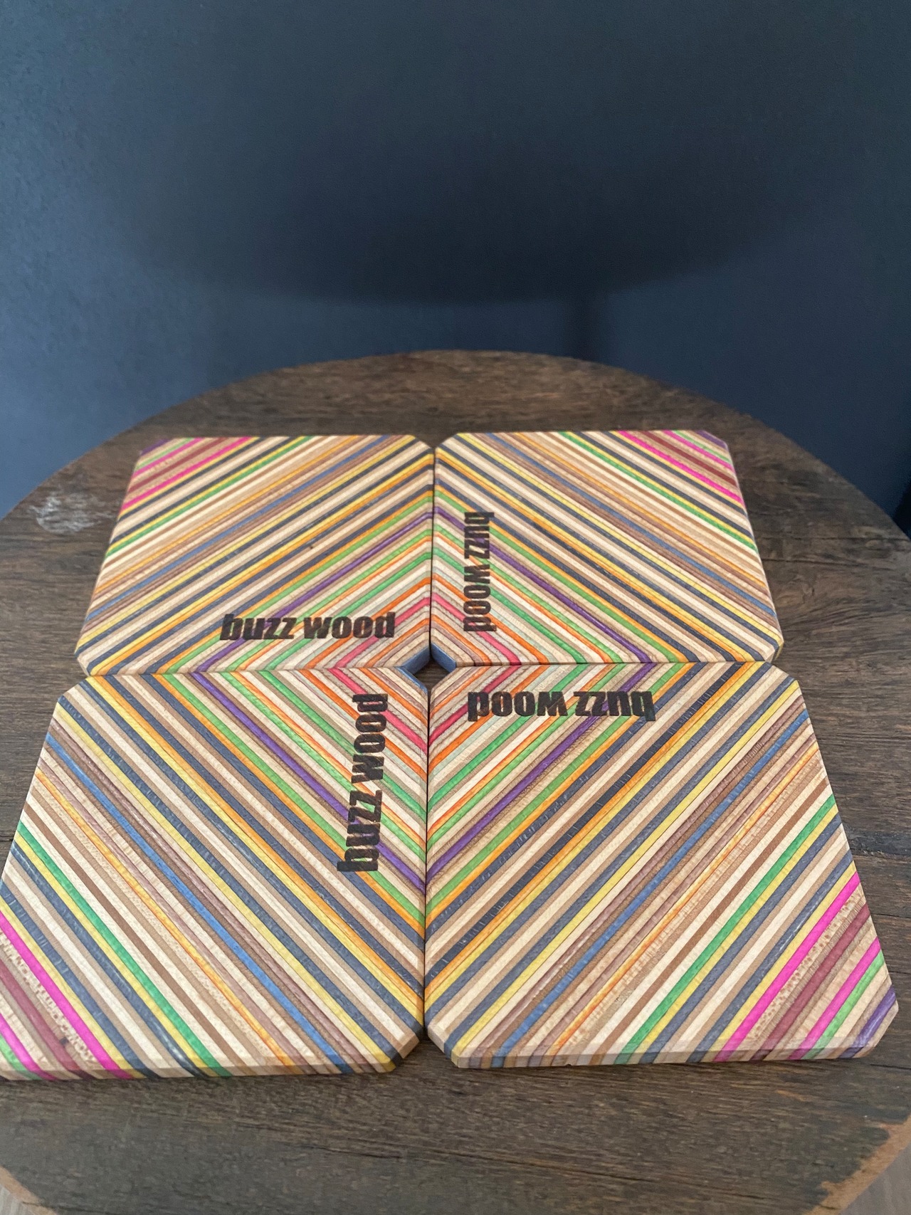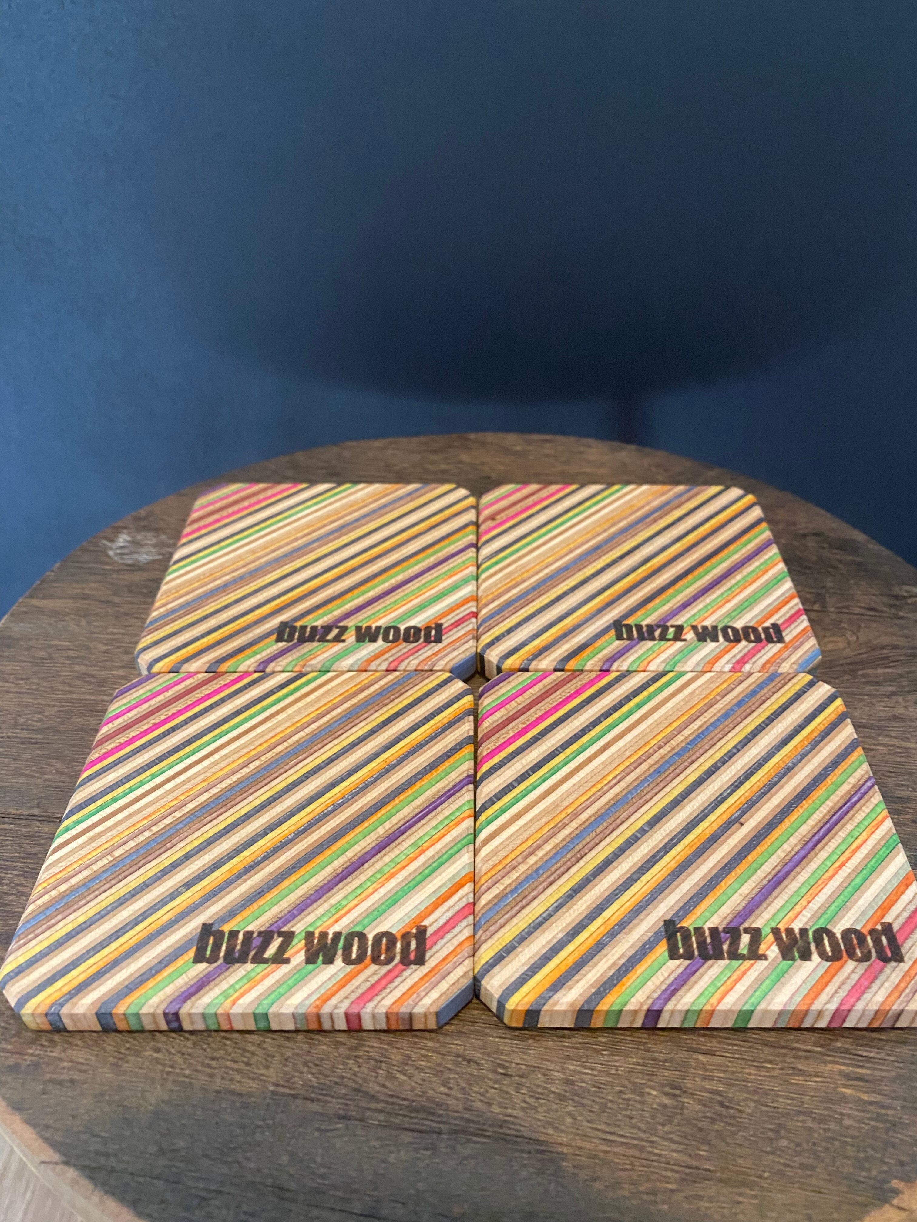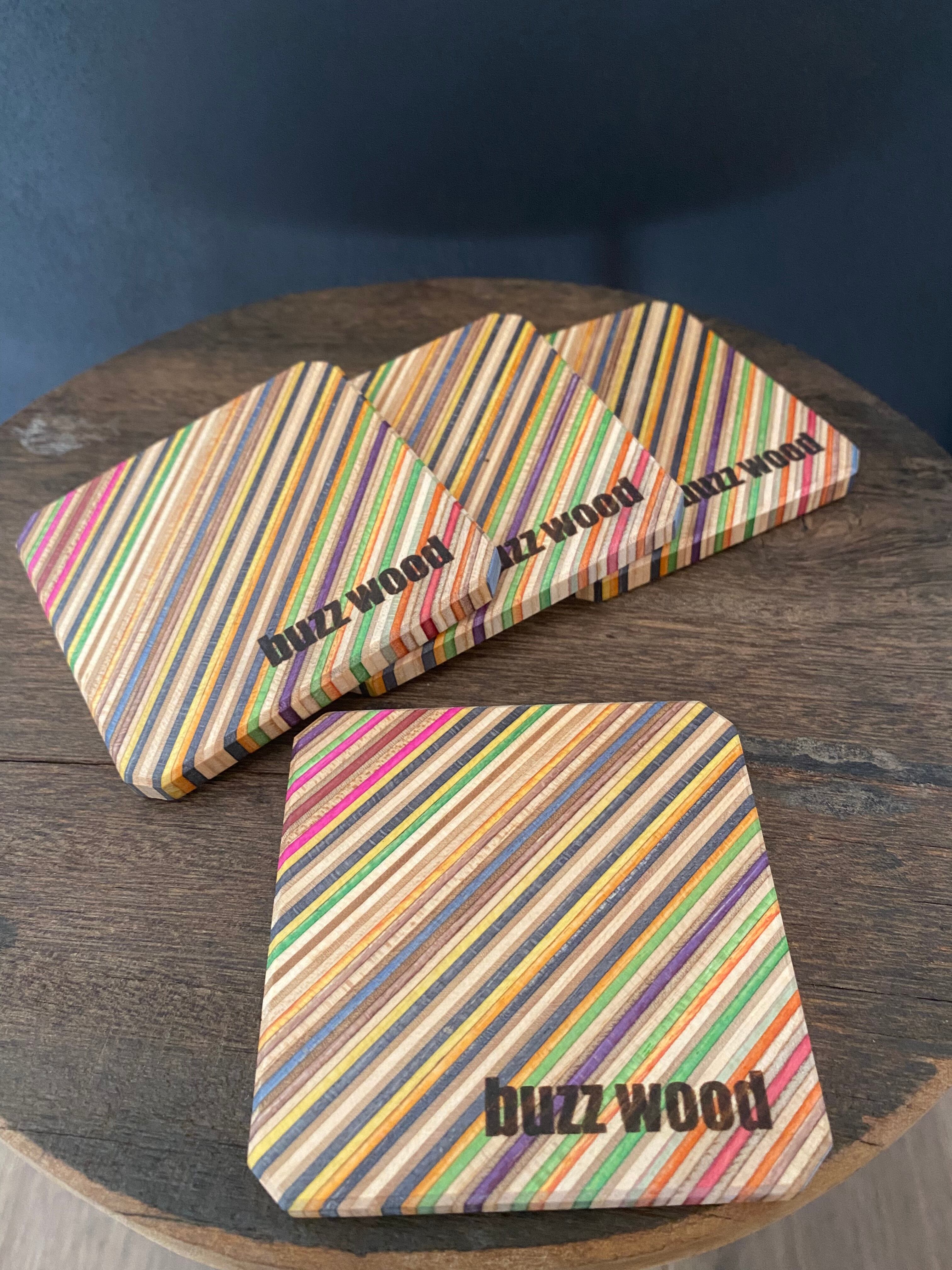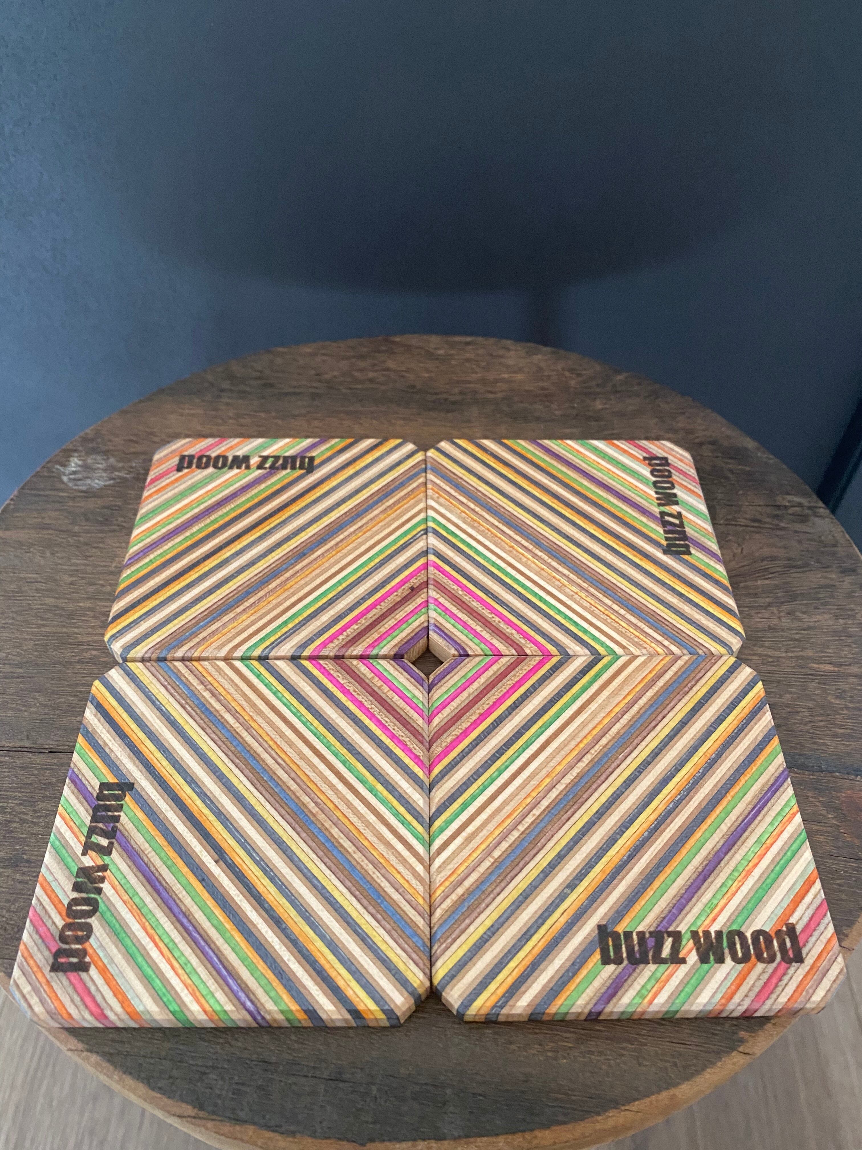スケボーの板(メープル)を何層にも圧着した、レインボーカラーが目を引くコースターになります。