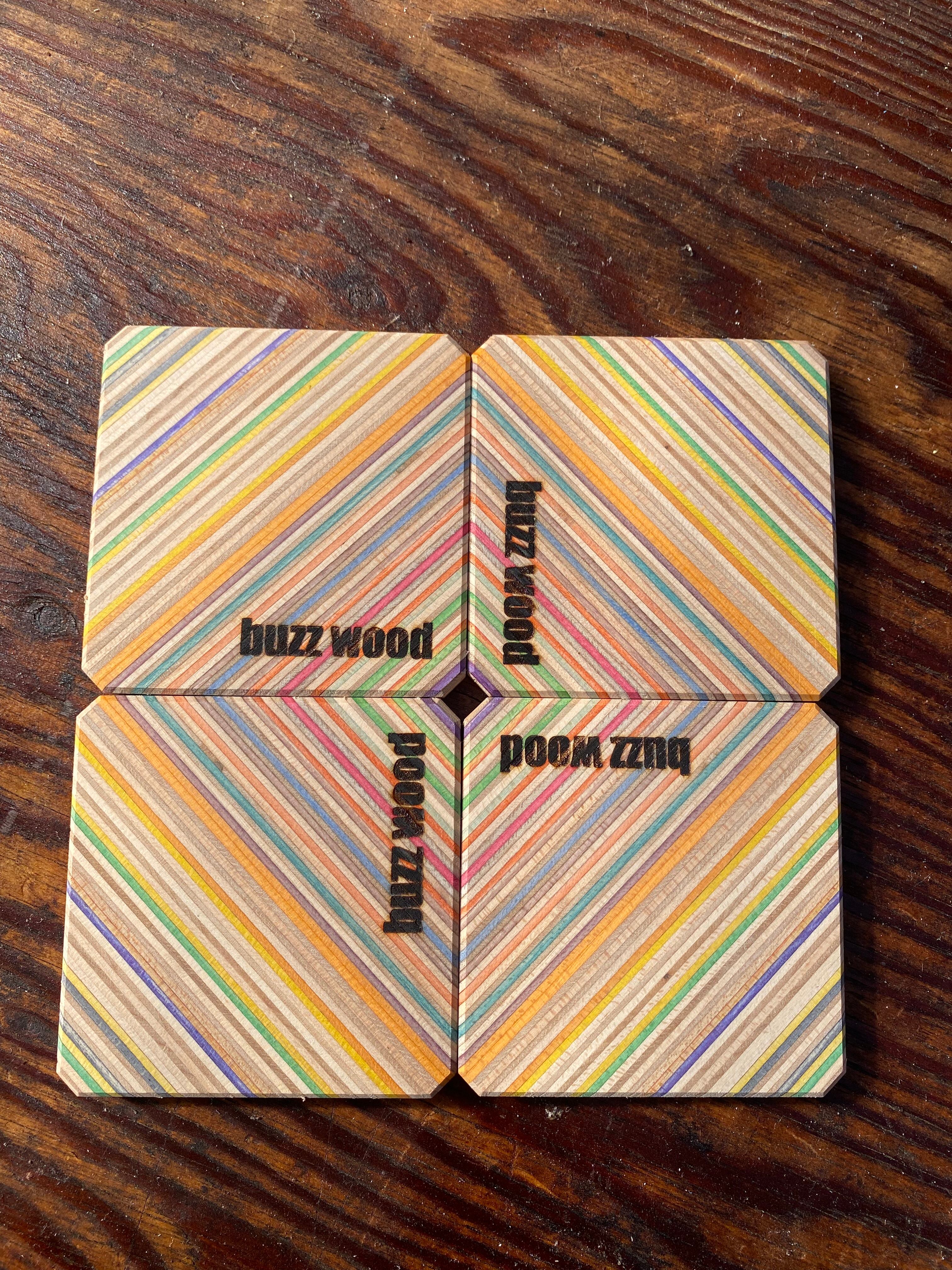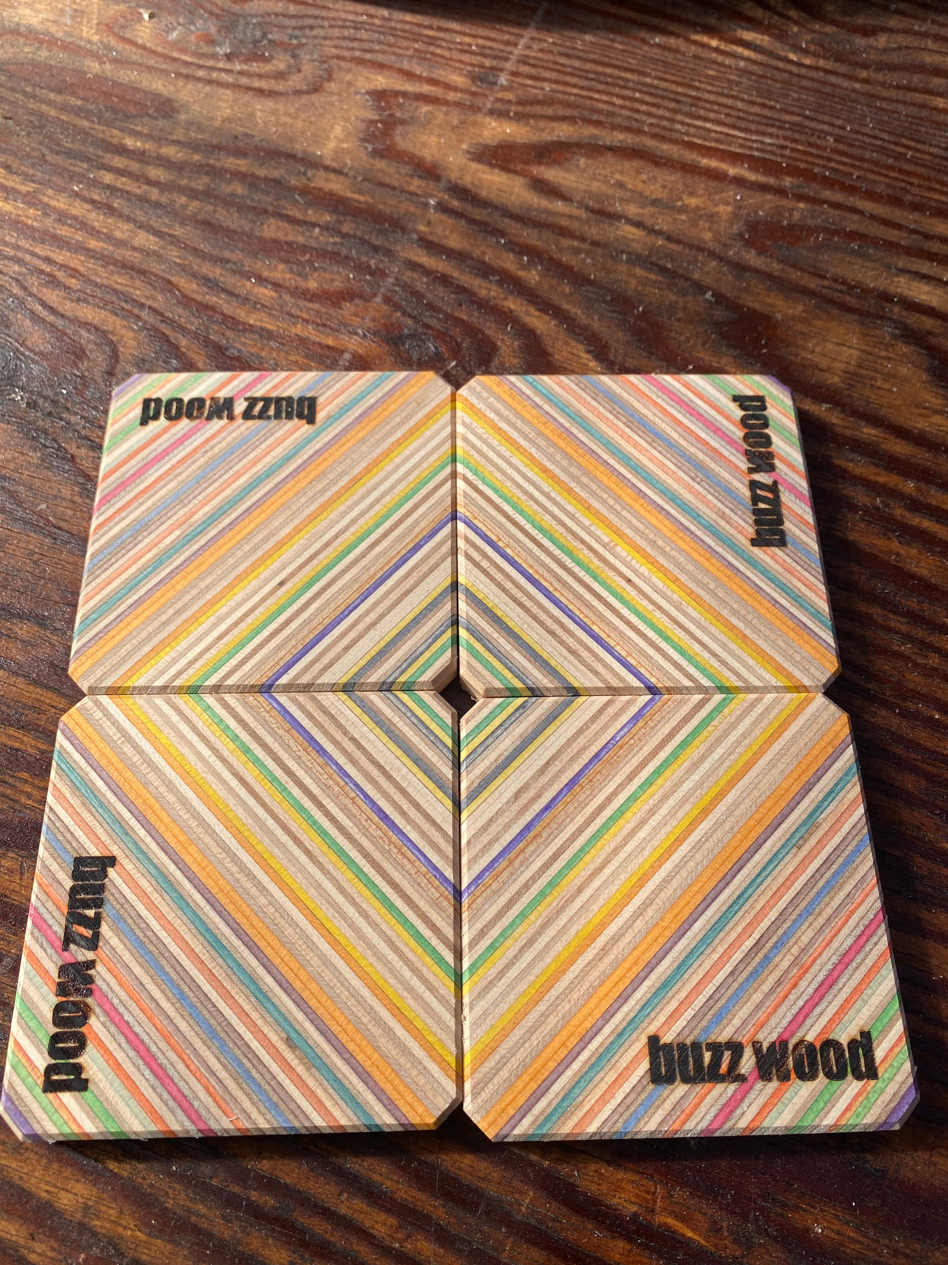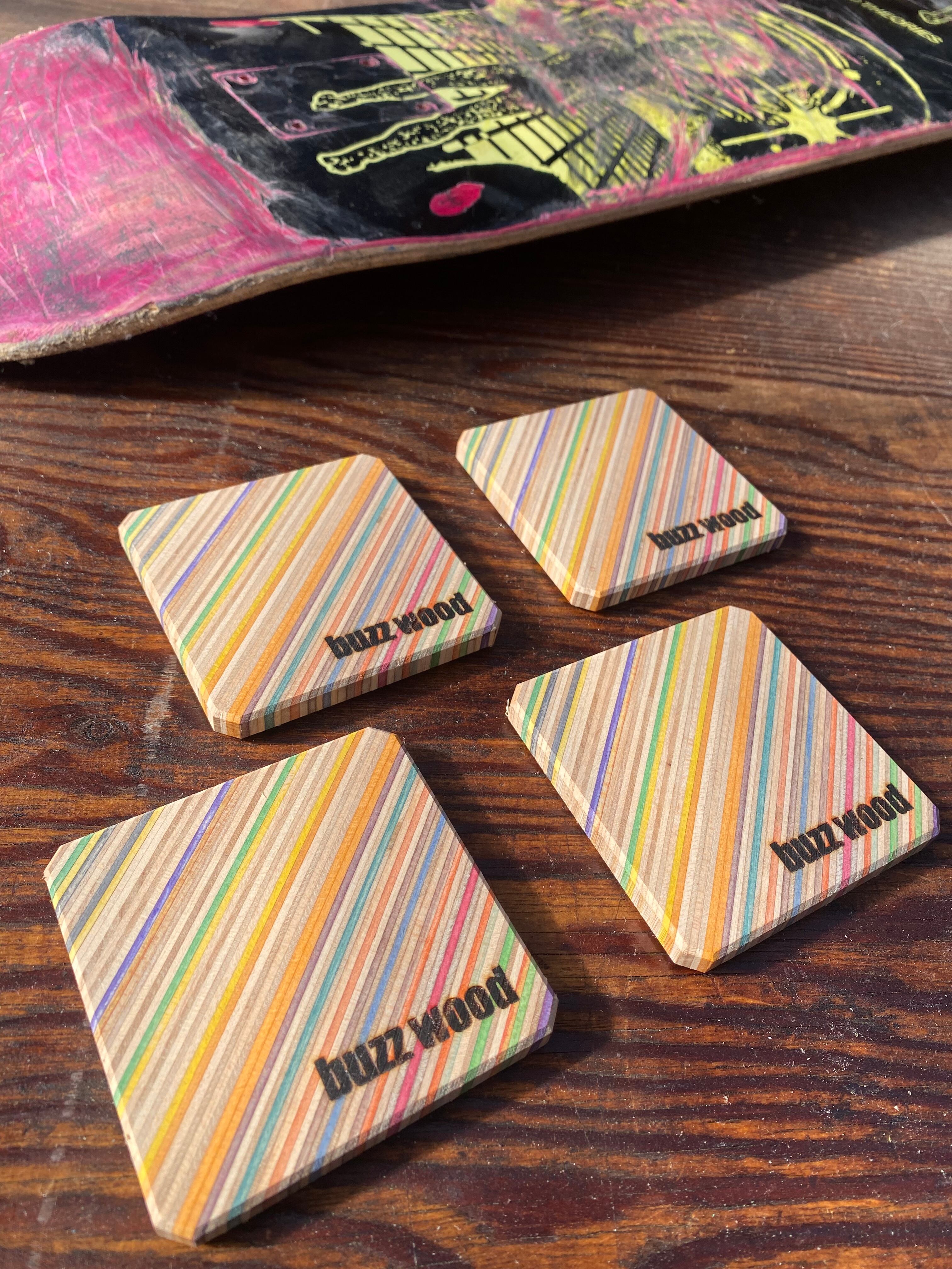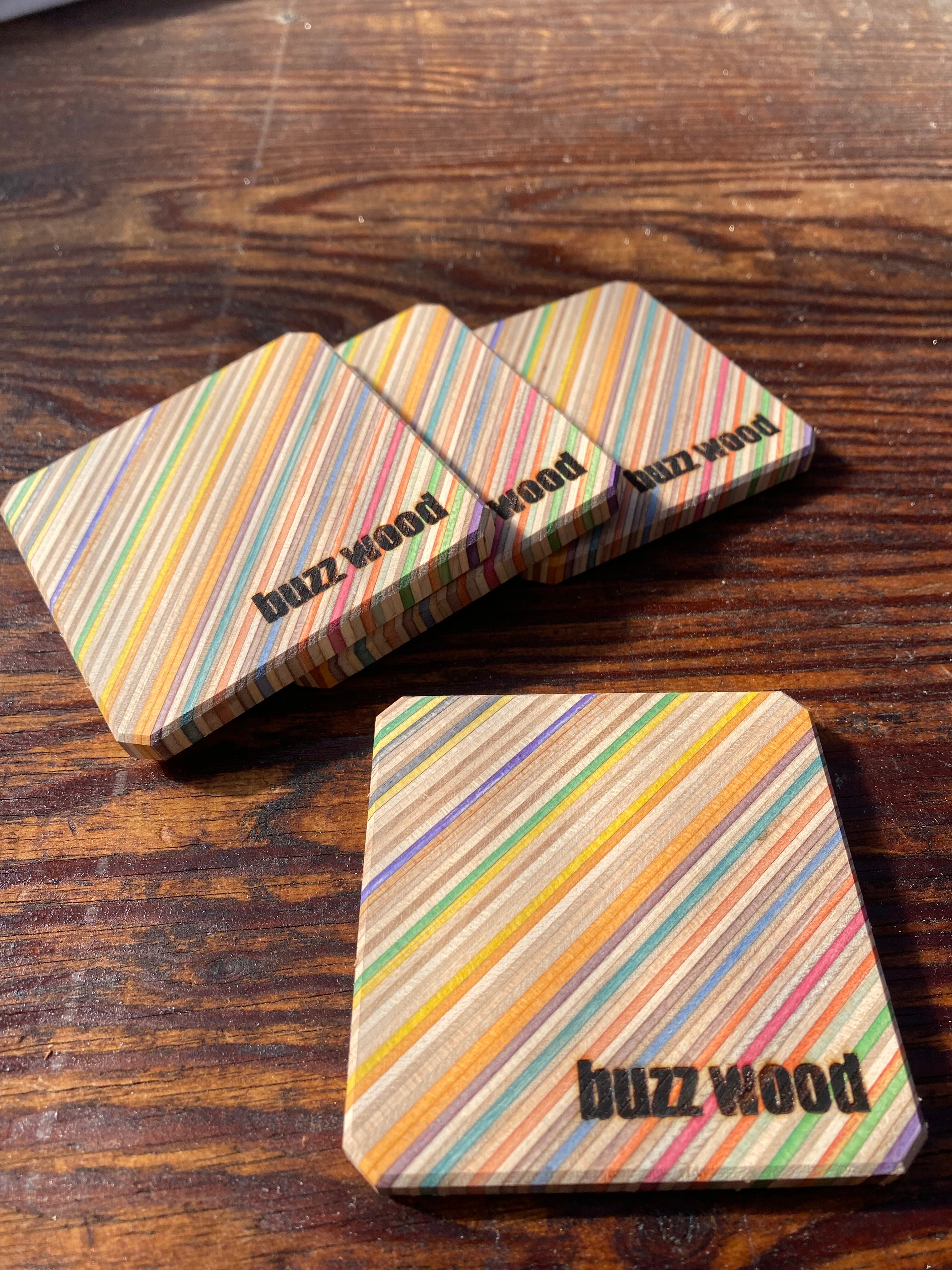 スケボーの板(メープル)を何層にも圧着した、レインボーカラーが目を引くコースターになります。